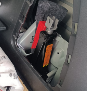 1、取下儲(chǔ)物格的們,松開(kāi)工具箱卡子后取出工具箱,轉(zhuǎn)動(dòng)千斤頂頂桿后松開(kāi)千斤頂,將千斤頂?shù)捻敳肯蛉藘A斜,緩慢取出千斤頂。