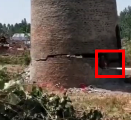上圖中的的高人便在用千斤頂來拆除廢舊的煙筒,這個煙筒被棄用多年,墻面的磚塊材質已經變軟,他先用工具在煙筒上鑿出一個小洞,再把千斤頂放進去,不斷搖動千斤頂的手柄,隨著升降套筒的上升,煙筒的上半部分開始慢慢向一側傾斜,直到倒塌。