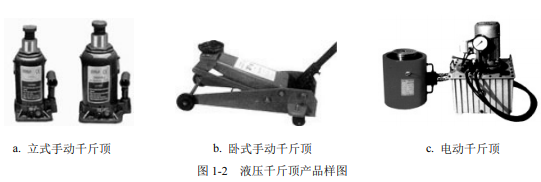 在實(shí)際應(yīng)用中,千斤頂?shù)漠a(chǎn)品設(shè)計形式是多種多樣的,可以滿足不同場合下的應(yīng)用。在較小噸位時,常用的有立式手動千斤頂(如圖 1-2(a)所示)、臥式手動千斤頂(如圖 1-2(b)所示);在較大噸位時,一般采用電動千斤頂(如圖 1-2(c)所示)。如果將圖 1-1 所示系統(tǒng)中的油液介質(zhì)換成空氣介質(zhì),因為空氣介質(zhì)直接取自大氣,并直接排入大氣,所以不需要圖示中的回油管與油箱裝置,其他元件的結(jié)構(gòu)與原理類似,圖示系統(tǒng)就可視為一個氣壓傳動系統(tǒng)。例如,生活中常用的打氣筒,就與上述小活塞缸工作原理完全相同。