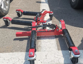 這種“輪滑鞋”是一種便攜式車輛拖移器,主要由臥式千斤頂和輪滑小車組成。