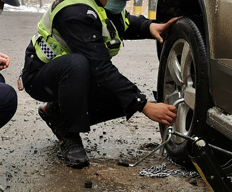 大部分防滑鏈都能被順利取出,但是有一小截防滑鏈被卡死在輪轂縫隙里不愿出來,交警就跪在冰冷的地面上用力摳,捅,掏,經過1個多小時的努力,最終將最后一部分殘留的鏈條清理出來。而我們的民警不顧自身寒冷的手腳,用專業的姿勢引導該車輛安全駛離。