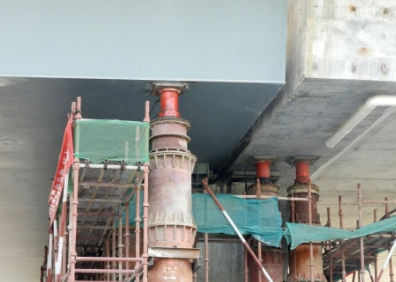 工人在施工過程中攻克了三只“攔路虎”:第一 ,首先用千斤頂支撐起橋墩,人工配合,利用機械半幅開挖,混凝土澆制。第二,采用新型的橋梁“植筋工藝”,把老木樁換成鋼筋混凝土,并在橋東建了 56米長的“擋水墻”,起到護理橋墩的作用。第三,加了伸縮縫,安裝了太陽能路燈。