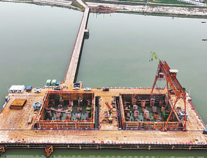 為了保持下放精度,這些液壓千斤頂也并非是各自用力,而是在液壓控制系統的控制下進行發力,才使鋼圍堰順利下放。大橋首節雙壁鋼圍堰成功下放入水為為大橋主墩由水下樁基施工向水上施工轉換提供了有力支撐,同時也為后續施工提供了參考依據。