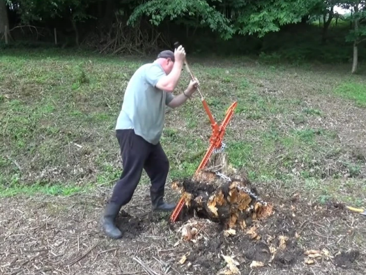 國外友人使用的是齒條千斤頂和鏈條組合的挖掘方法,他先是將鏈條環(huán)繞在木樁上,然后另一端和齒條千斤頂活動的鐵臂連接,然后不斷的按壓齒條千斤頂?shù)氖直诟軛U原理的作用下,很快一顆粗大的樹樁便被連根拔起,看上去十分省力,這不禁讓我們眼前一亮。
