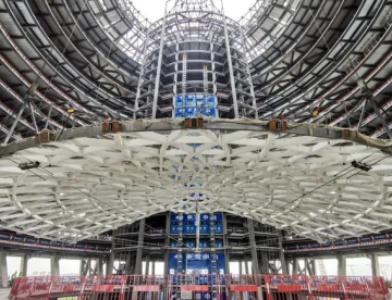 2022年5月13日,浙江湖州“太陽酒店·水晶晶廣場”項目1號樓施工現場,施工人員使用液壓提升設備、鋼絞線、牽引器等設備成功將一個巨大的蝴蝶狀穹頂網殼提升到97.4米高空。