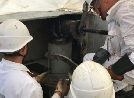 在一切準備工作就緒后,維修艙蓋液壓千斤頂工作正式鋪開。拆解千斤頂,拔出千斤頂與艙蓋間的銷子是關鍵,在船員們的一番努力下,千斤頂銷子依然紋絲不動,大家的衣服都已濕透,汗水順著安全帽的帶子不斷往下滴,但并沒有動搖船員們拆拔銷子的信心,不斷的采取新方法、調整新方式,三管輪持續的錘擊,一番操作下,突然,扳手一下子沒那么吃力,銷子終于松動了。激情高漲的船員們,隨著一錘一錘的敲擊和往外被一點點的頂拉,經過一天的努力,銷子終于順利取出。接著用葫蘆將千斤頂吊出,現場解體千斤頂壓蓋螺絲,抽出柱塞,更換壓蓋密封令,船員弟兄們經過兩天的檢修,順利完成五艙右前的千斤頂更換密封令的修理工作。