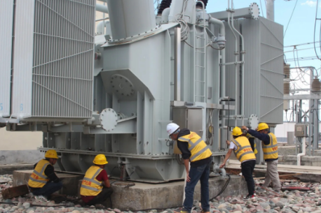 為確保變壓器能夠順利準確復位,在施工過程中,中鐵電氣化局蘭新客專門源震災整治項目部組織專業人員8人、6臺液壓千斤頂,經過6個小時的緊張施工,順利完成干柴灘牽引變電所首臺2.5萬千伏安主變壓器復位工作。