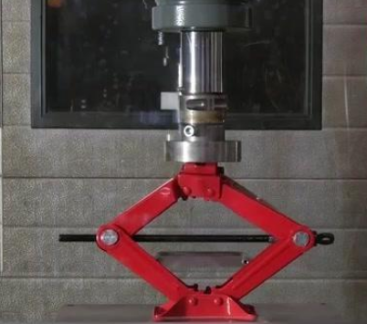 在液壓千斤頂與液壓機的PK中,液壓千斤頂后果慘重,機身粉碎,液壓油四濺,而很快又有人提出了機械千斤頂出戰,看看能不著液壓機的不斷加壓,剪式千能抗衡液壓機。于是剪式千斤頂出動了,隨斤頂的結構慢慢的變形,最終被徹底壓垮,連橫向螺桿都彎曲了,結果又是液壓機完勝。