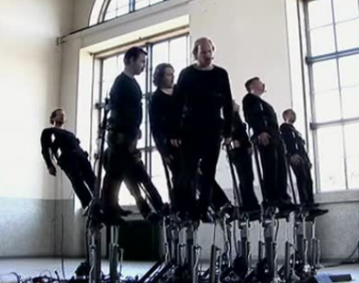 這個讓我們不可思議的歌唱者們是一個合唱團:“鐘擺合唱團”,他們在表演時系上安全帶,兩只腳分別站立在兩個千斤頂上,自己的身體隨著千斤頂?shù)膿u擺幅度而來回晃動,每個人晃動的方向、高度不同,從遠處看起來,就像海上起伏的波浪,讓人捉摸不透。關(guān)鍵是表演者的聲音沒有絲毫受到影響,反而讓他們發(fā)出的聲音界于抽象、重復(fù)、抒情與敘事之間。