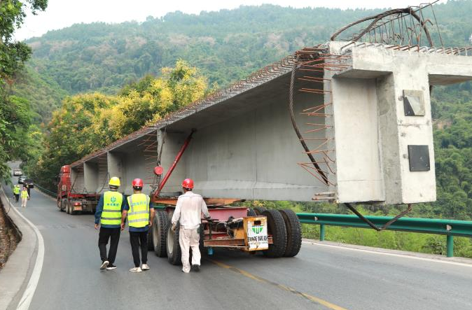 80噸的重量問題倒不是運輸的難點所在,因為現場所采用的大型運輸車擁有足夠的負載,主要的運輸難點在于T梁如何安全平穩的固定在運輸車上。由于山路崎嶇,稍有顛簸傾斜都有可能造成T梁傾覆,甚至連帶運輸車發生翻車事故,于是現場施工人員采用了一種較為穩妥的方式。